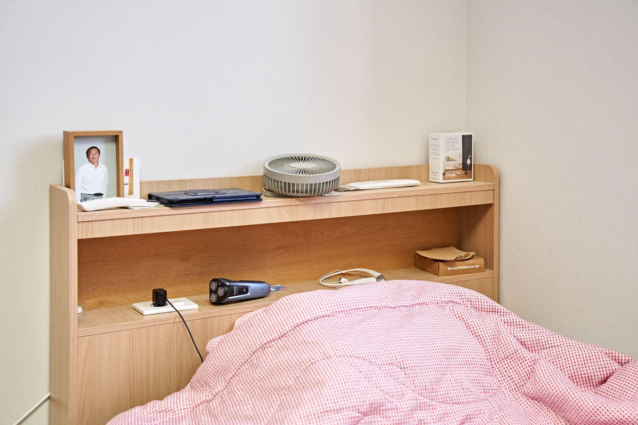 침대 선반 위에 물건이 여러 가지 놓여 있네요? 깨끗하게 정리되어 있어요.