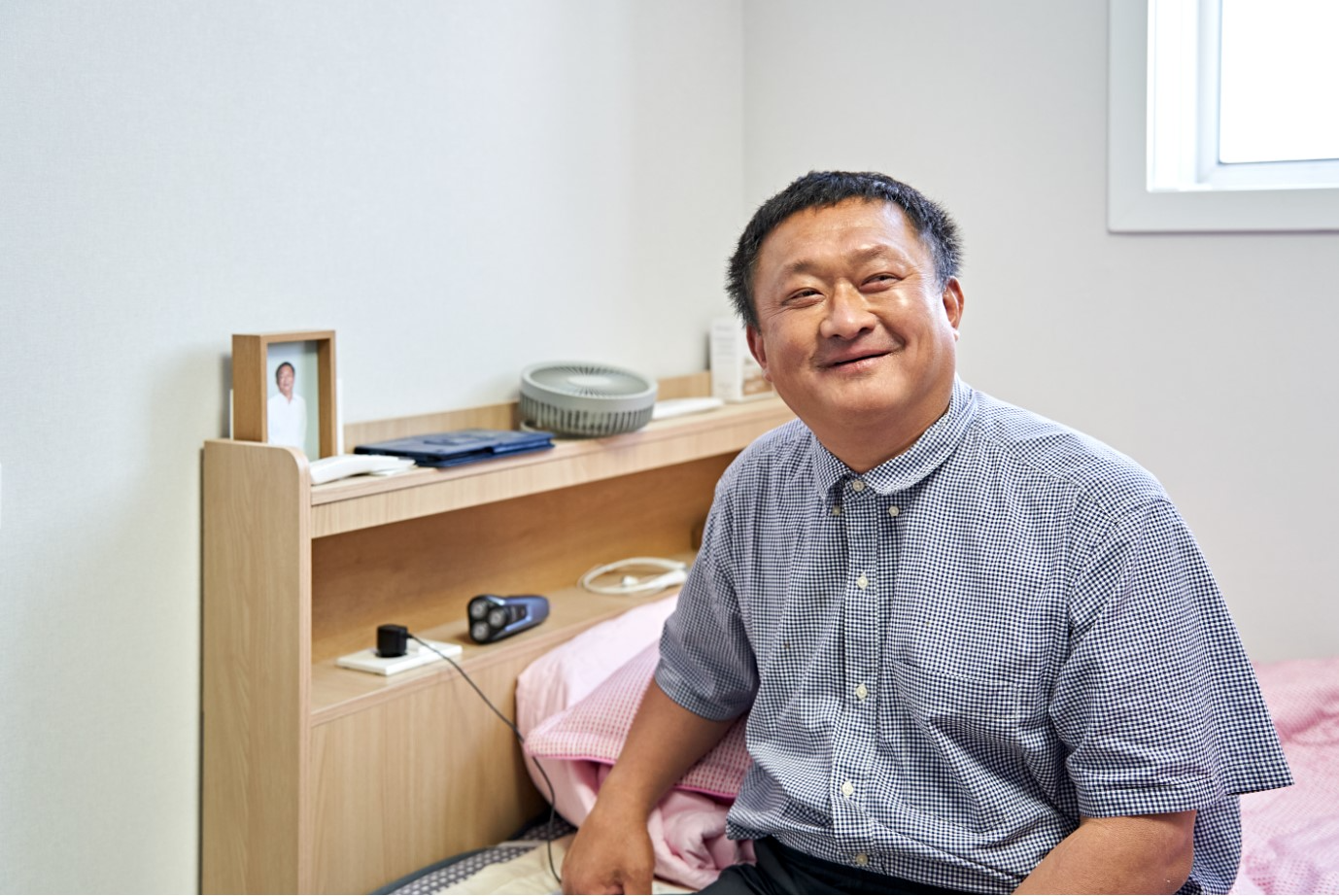 복지관에서 찍은 사진을 액자에 넣어 두었어요. 선풍기나 면도기도 여기에 올려 놨어요.