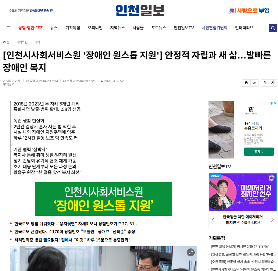 (인천일보0429) 인천시사회서비스원 '장애인 원스톱 지원' 안정적 자립과 새 삶.. 발빠른 장애인 복지