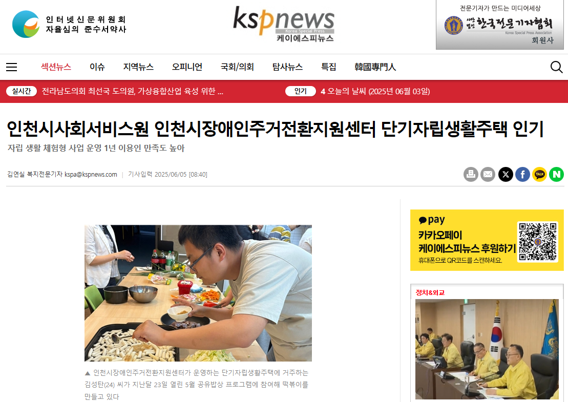 (케이에스피뉴스0605) 인천시장애인주거전환지원센터 단기자립생활주택 인기
