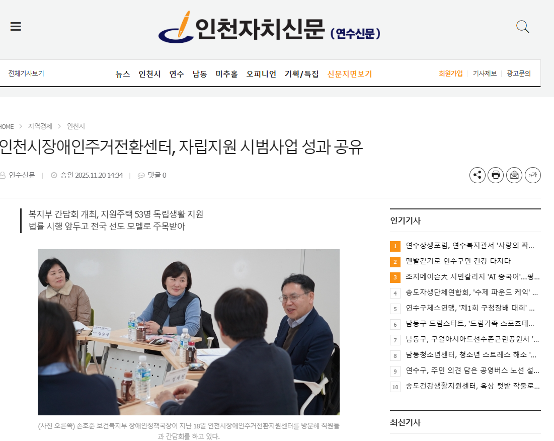 (연수신문 1120) 인천시장애인주거전환센터, 자립지원 시범사업 성과 공유