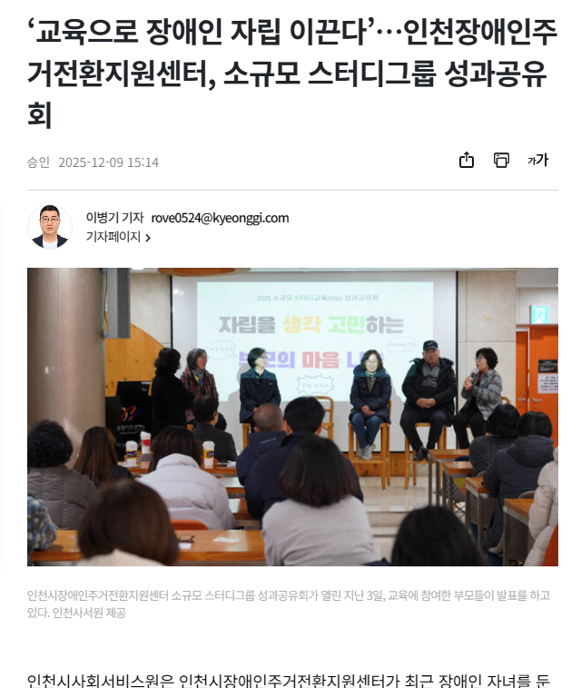 (경기일보 1209) ‘교육으로 장애인 자립 이끈다’…인천장애인주거전환지원센터, 소규모 스터디그룹 성과공유회