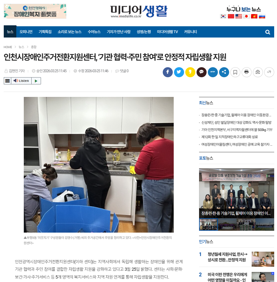 (미디어생활 0325) 인천시장애인주거전환지원센터, '기관 협력·주민 참여'로 안정적 자립생활 지원