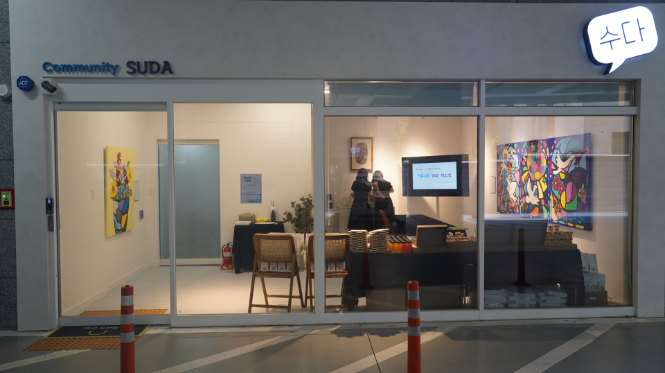 전면은 통유리라 시야가 탁 트인다. 통유리 너머로 벽에 걸린 364×117cm에 이르는 커다란 그림이 눈길을 끈다. 그림은 화려한 스테인드글라스를 캔버스로 옮겨놨다. 창문 위로는 새가 날아다니고 꽃이 흩날린다. 새파란색 바탕에 하얀새, 알록달록한 조각이 조화를 이룬다. 그림 제목은 ‘잇다’이다. 각각 다른 조각이 모여 아름다운 이미지로 탄생한다는 의미를 지녔다. 수다 입구에는 ‘함께 심은 꽃’을 제목으로 한 작품이 눈에 띈다. 두 작품 모두 임지연 작가가 밑 배경 작업을 하고 지원주택 입주 장애인 12명이 이틀에 걸쳐 직접 그렸다. 지역사회에서 함께 하고자 하는 의지를 담았다. 이곳은 이후 주민 참여 프로그램을 운영해 거기에서 나온 작품을 전시하는 갤러리로 활용할 계획이다.