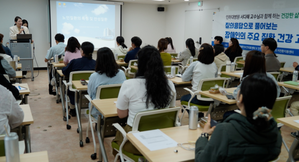 첫 번째 시간으로 서다혜 인하대병원 내분비내과 교수가 ‘노인질환의 특징 및 만성질환’을 주제로 강의했으며, 이어 안은지 인천지역장애인보건의료센터 작업치료사가 ‘장애인 건강권의 이해’를 강의했다.